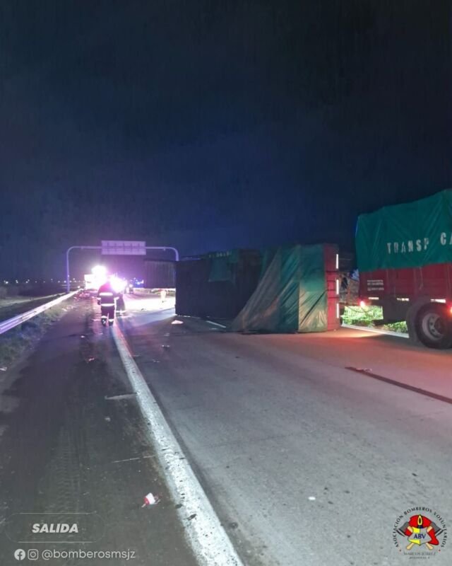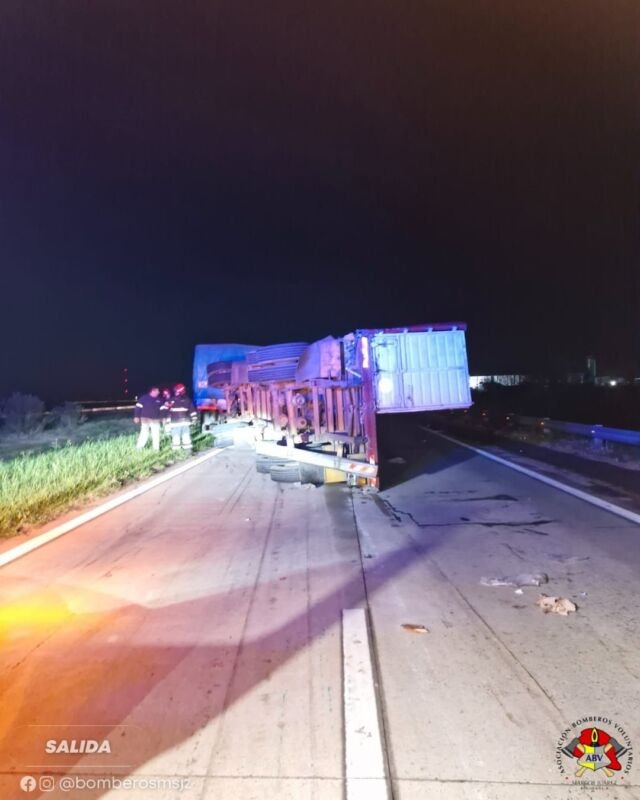 El camión que sufre el impacto desde atrás vuelca su acoplado y la totalidad de su carga, dejando bebidas en toda la calzada asfáltica.