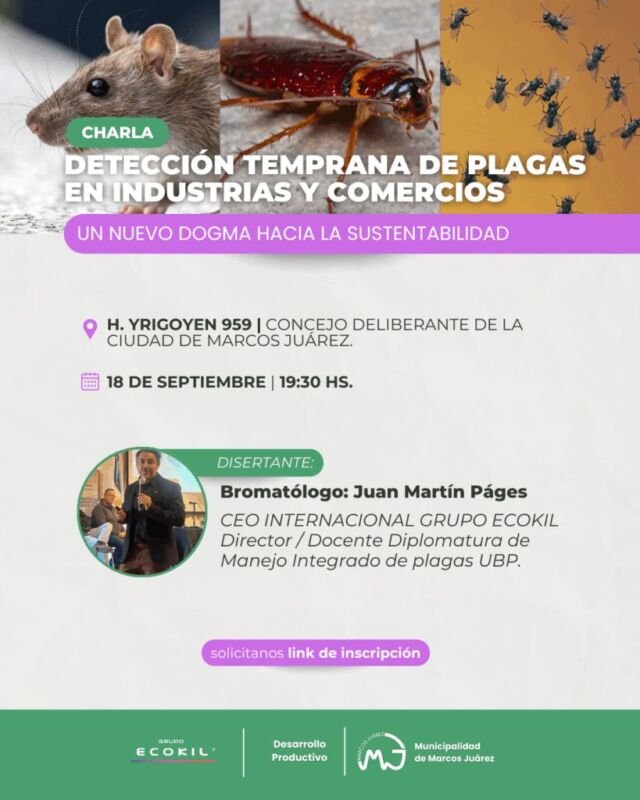 La Municipalidad de Marcos Juárez invita a los vecinos a participar de una charla informativa sobre detección temprana de plagas en industrias y comercios, que se realizará el próximo jueves 18 de septiembre a las 19.30 h en el Concejo Deliberante, Yrigoyen 959.