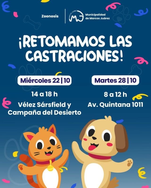 La Municipalidad de Marcos Juárez, a través de la Secretaría de Salud, confirmó la vuelta de las castraciones masivas y gratuitas en la ciudad.