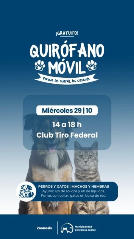 La Secretaría de Salud, a través del Área de Zoonosis, informó que el próximo miércoles 29 de octubre se realizará una nueva jornada de castraciones en Marcos Juárez.
