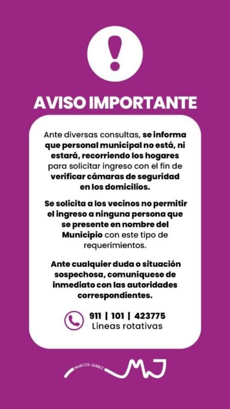 Ante diversas consultas de las últimas horas, la Municipalidad comunica que ningún empleado ni área del gobierno local se encuentra realizando visitas a los hogares para solicitar ingreso o revisar cámaras de seguridad particulares.