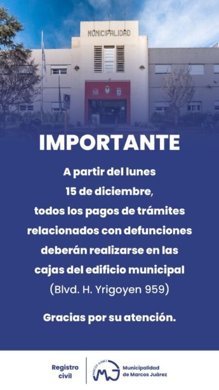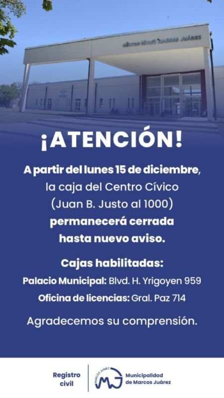La Municipalidad informa que, desde el lunes 15 de diciembre, la caja ubicada en el Centro Cívico, Juan B. Justo al 1000, permanecerá cerrada hasta nuevo aviso.