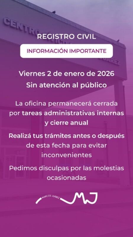 La Municipalidad de Marcos Juárez, a través del Registro Civil, informa que el próximo viernes 2 de enero no habrá atención al público en dicha dependencia.
