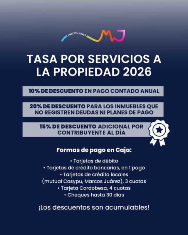 La Municipalidad de Marcos Juárez informa que hay descuentos acumulables de hasta un 45% en la tasa por servicios a la propiedad.
