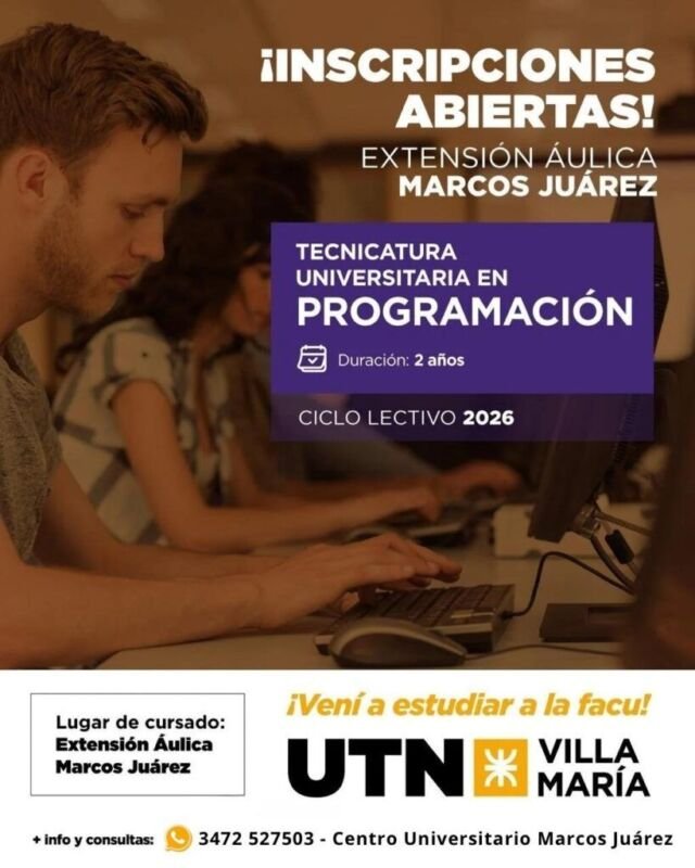 La Municipalidad de Marcos Juárez informa que ya están abiertas las inscripciones para la Tecnicatura Universitaria en Programación 2026 de la Universidad Tecnológica Nacional (UTN) – Villa María.