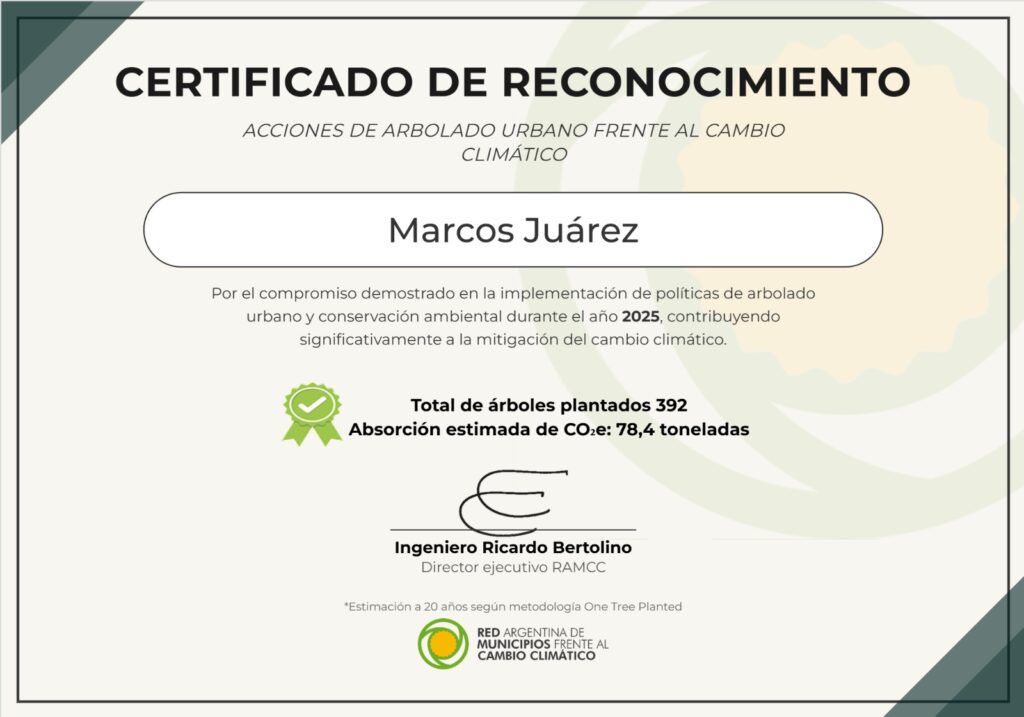 La ciudad de Marcos Juárez recibió un reconocimiento por parte de la Red Argentina de Municipios frente al Cambio Climático (RAMCC), en virtud del compromiso demostrado durante el año 2025 en la implementación de políticas de arbolado urbano y conservación ambiental.