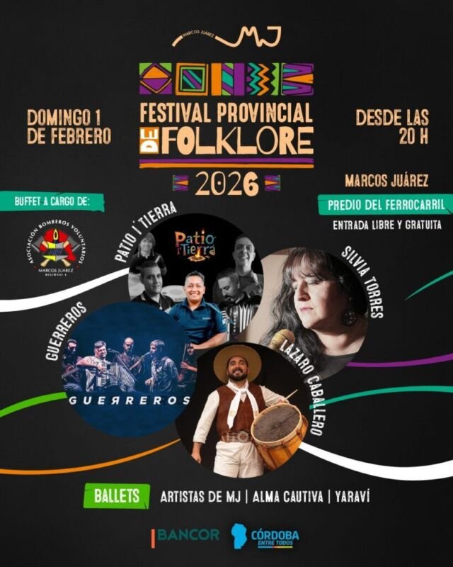 El próximo domingo 1 de febrero, desde las 20 h, se llevará a cabo el Festival Provincial de Folklore en la ciudad de Marcos Juárez. El evento tendrá lugar en el Predio del Ferrocarril y reunirá a destacados referentes de la región y del país, como Lázaro Caballero, Silvia Torres, Guerreros y Patio Tierra.