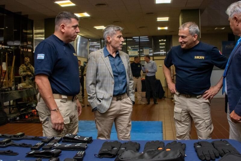 Además, el ministro participó en primera persona de una prueba de concepto de guantes con descarga eléctrica que el Ministerio de Seguridad está estudiando para su implementación en la fuerza policial.