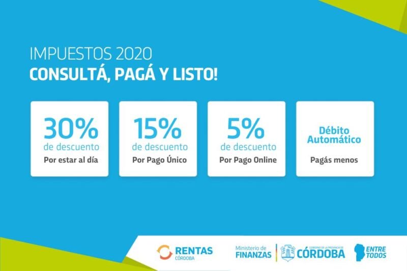 El Gobierno de la Provincia de Córdoba anunció este martes la prórroga hasta el 20 de febrero del vencimiento del Pago Anual y de la primera cuota del Impuesto Inmobiliario Urbano, y la primera cuota del Inmobiliario Rural.
