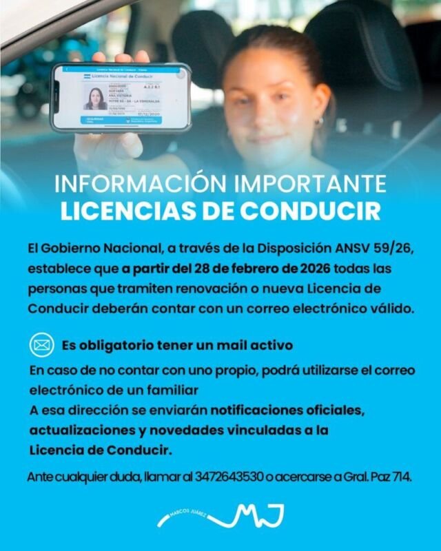 Mediante la Disposición ANSV 59/26 se establece que, a partir del 28 de febrero de 2026, todas las personas que tramiten la renovación o una nueva Licencia de Conducir deberán contar con un correo electrónico válido.
