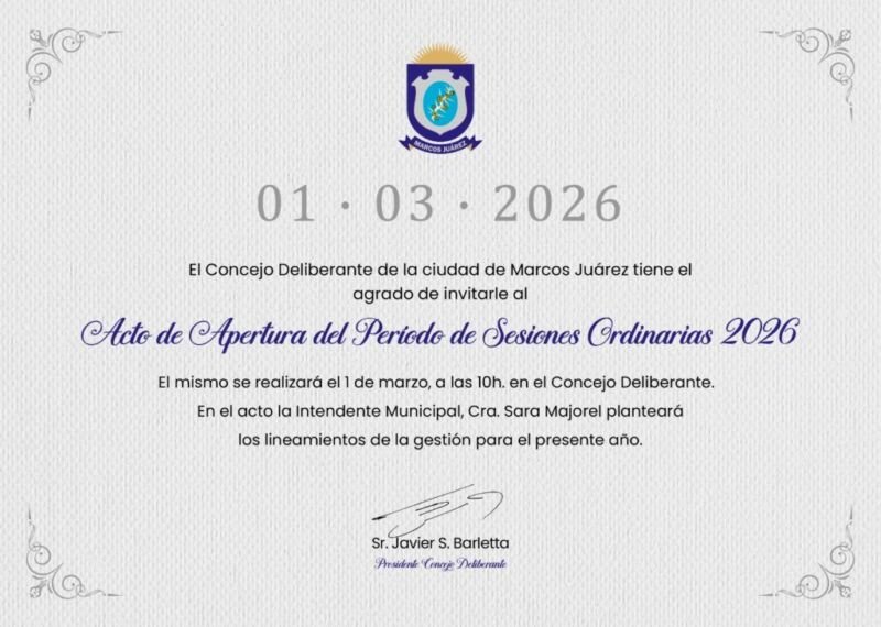 El próximo domingo 1 de marzo a las 10 h, el presidente del Concejo Deliberante, Javier Barletta, invita a los vecinos al acto de apertura de sesiones del cuerpo legislativo.