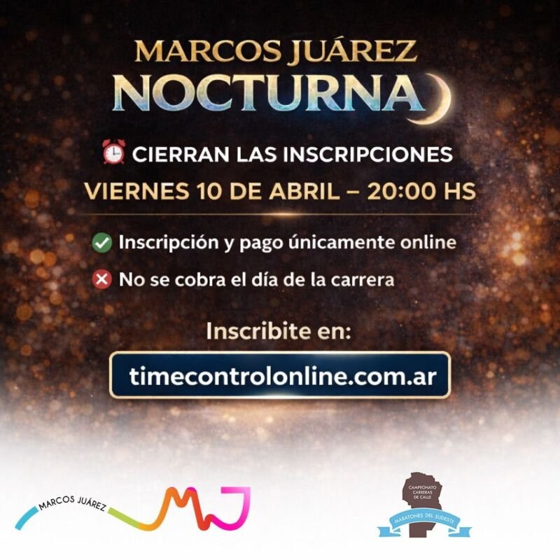 La Comisión de Deporte, junto a la Municipalidad de Marcos Juárez, informa que el próximo sábado 11 de abril a las 20 h se largará la Maratón Nocturna Marcos Juárez 2026, en el marco del Campeonato de Maratones del Sudeste.